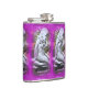 The flask itself is fine. It’s a cheap flask, obviously bought in bulk, however am prepared to overlook that. Given that it is a personalized item, I would have liked to have seen gift boxing instead of the generic packaging. Terrible printing, and/or quality. It’s a cheap, tacky vinyl. It is not cut straight and is also applied in a way that it is overhanging the bottom, causing the glue to catch on items and it will eventually roll and tear, damaging the wrap.