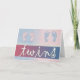 Pink and blue footprints against a soft pastel background with twins in fun font. Easily add shower invitation message or new announcement pictures inside.