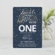 Cute Twinkle Twinkle Little Star first birthday invitation, featuring a trendy navy blue background, a faux gold abstract rainbow, a scattering of gold stars, the sweet saying ' twinkle twinkle little star, ONE years old is what you are!' and a modern template that is easy to customise.