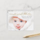 Twinkly gold stars fall all around a sweet baby (customise with your own newborn photo) with "twinkle twinkle little star" in fancy gold glitter effect script (note no actual gold glitter or leaf will be printed on the paper - it will just print to look like gold glitter). This birth announcement postcard is simple, chic and sweet, with the script adding an elegant flair. Use a picture of baby on a soft white background, so the text will be readable and the stars will stand out. Optionally, don't forget to check the back, where you can upload another photo of baby in a fun taped-up polaroid frame and add a personal heartwarming message to the postcard! Perfect for baby boy or baby girl.