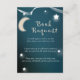 Book Request form that matches the twinkle, twinkle little star baby shower invitation.  Moon and stars with a white silvery ribbon decorate the nighttime blue background on this adorable Book Request card.  The poem wording reads: