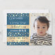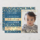 Adorable, shiny gold stars in combination with navy blue background. Cute, modern, celestial baby boy's 1st Birthday Save The Date invitation, with custom photo.