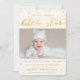 Twinkle twinkle little star first birthday party invitations for a boy or girl, with a custom photo of baby and grey and gold stars against a simple sophisticated cream background. "Twinkle, twinkle little star, one year old is what you are!" is in gold and grey, with first birthday party details below. You can the cards as first birthday announcements as well.
