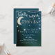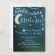 Cute baby shower invitation with a twinkle, twinkle little star theme. Dark blue sky with playful white stars and a soft pink and cream crescent moon. Twisty white ribbon decorates the top. Easy to edit for your own twinkle twinkle little star theme.