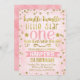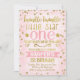 Cute faux gold glitter and pink watercolor nursery rhyme first birthday invitation for a little girl. The design features some faux gold foil text, stars and dots and is a lovely way to set the scene for your little girls stars themed first birthday party.