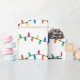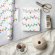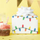 Simple rainbow coloured Christmas lights set against a snowy-white background.