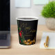 These gorgeous Merry Christmas party paper cups feature modern gold handwritten script over twinkling lights next to a festive Christmas tree that is decorated with red and green ornaments. Customise this elegant holiday celebration decor with personalised script over the black night sky.