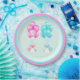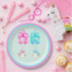 Creative baby shower twins plates featuring twin boy and girl beneath bouquets of pink and blue balloons.