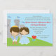 Cute princess & prince birthday invitations with blue polka dot background and castle.