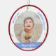 Trendy, elegant, and cute personalized First Christmas Baby Ornament for twin baby boys for a godfather with a white frame with snowflakes and stars that has a round opening for a custom horizontal photo, and a curved blue band on each side on which appears the name or names of the twins in an elegant script font / typography. This design includes on the front the words "We love you, Grandfather Jason!", which you can personalize or delete. On the back there's a custom text for the year of the babies' first Christmas. With an outer Xmas red frame.