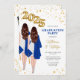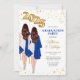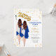 Twins double Graduation Party Invitation. Female twins double graduation combined graduation party celebration. Portrait of twin women with long brown hair in white dresses with blue graduation robes and graduation caps with gold balloons for class of 2025. Feature both twins on the back of the card with their photos, names, schools and degrees.