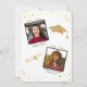 Twins double Graduation Party Invitation. Female twins double graduation combined graduation party celebration. Portrait of twin women with light red hair in black dresses with blue graduation robes and graduation caps with gold balloons for class of 2025. Feature both twins on the back of the card with their photos, names, schools and degrees.