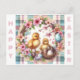 Colourful Easter postcard featuring two ducklings surrounded by beautiful spring flowers and a nest full of Easter eggs. The background has a soft plaid pattern in pastel colours that complements the overall aesthetic. Perfect for a twins' first Easter party.