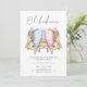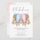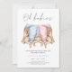 A twin gender reveal party invitation. A watercolor illustration of twin babies in blue and pink baby grows is flanked by elegant black typography text that reads oh babies.