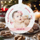 Trendy, elegant, and cute personalised First Christmas Baby Ornament for twin baby girls with a white frame with snowflakes and stars that has a round opening for a custom horizontal photo, and a curved pink band on each side on which appears the name or names of the twins in an elegant script font / typography. This design includes on the front the words "Our first merry little Christmas 202X"