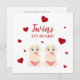 This baby shower invitation for twins has a modern and fun design with a babies illustration in red and hearts.