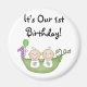 Two peas in a pod first birthday tshirts, bags, bodysuits, magnets, and other first birthday clothing and gifts with babies in a pea pod and text that reads "It's Our 1st Birthday!".