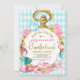 Cute Alice in wonderland themed first birthday invitation for twin girls featuring a large white rabbit watch, various pink floral arrangements, white rabbit, a mad hatter's hat, tea pot and various other items from the story. The design also features a removable faux gold foil word in a cute calligraphy style and a baby blue diamond shaped pattern background. Your little girl's photo appears on the back.