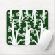 A mouse pad with an interesting decorative drawing of unusual twirly looking plants.