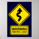 Warning - Twisted Logic - dark blue poster with a yellow and black curve warning sign style design.