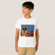 100% cotton so perfect for summer, It is a nicely designed t-shirt, the fabric is soft and the seams finished well, the body of the t shirt has no side seams. I bought a medium size for my two grandsons, aged 9 and 8 it will be slightly big on them but I would rather that than too small