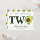 An avocado 2nd birthday invitation for your toddler. This invitation is white and green with the word "Two" in large letters with an avocado illustration as the last letter of the word. It's great for an avocado, fruit and vegetable, or general food theme. Simply customise this invitation, add it to your cart, and happy birthday to your wonderful toddler!