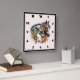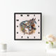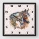 Clock with an image featuring a pair of horses. Wearing decorative headbands. Surrounded by feathers and foliage.