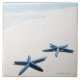 Two blue starfish at water's edge on tropical tile