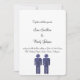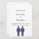 A simple white wedding invitation with two blue glitter figures of men on the bottom of the card. This invitation reads, "Together with their parents NAME & NAME invite you to celebrate their wedding on DATE at TIME, LOCATION"