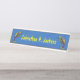 This desk or hanging name plate is blue with two brightly coloured abstract fish in orange, yellow, red, blue and green at each end. Customise your name with the template.