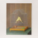 This design features a painting by the Italian artist Antonio Donghi (1897–1963). It shows two yellow canary birds sitting on a wooden perch in their metal cage. The birds are facing in opposite directions from each other, so one bird's tail is next to the other bird's head. There appears to be a piece of lettuce or some other greenery at the bottom of the cage. The cage is resting on a table, which is covered by a green tablecloth. The table is up against the wall, which is decorated in orangey brown wallpaper. The yellow birds seem relaxed and contented in their cage.