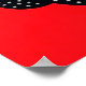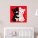 Two cartoon-style bears, one black and one white, embracing each other. The black bear has round ears and is adorned with dotted patterns, with rosy cheeks adding to its endearing expression. It has a beige patch on its belly. The white bear, also covered in dotted patterns, has a cheerful smile and rosy cheeks as well. The background is a vibrant red, which contrasts brightly with the bears. Overall, the illustration conveys a sense of warmth and friendship.