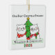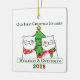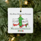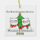 Two white cats wink at each other with red and white polka dot bandanas with a Christmas tree behind them. Our First Christmas Engaged is above the cats, with personalised names under them and the year, which is an outline with red and green numbers placed outside the outline. So cute! On the back, there is a Christmas tree with a heart on top and a small text box for leaving a sweet note. This design is ideal for cat lovers and cat owners who are spending their first Christmas together as an engaged couple.
