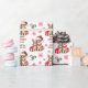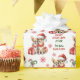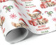 The repeated pattern on this Christmas wrapping paper is of two little brown Chihuahua dogs. Each is wearing a red Holiday necklace, and one is wearing a red and white Santa hat. Brightly wrapped gift packages sit beside them. Red text says MERRY CHRISTMAS", with your chosen name and your signature below. Other images included in the pattern include red decorative snowflakes and candy canes.