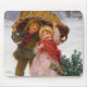 Vintage illustration of a boy and a girl joyfully dragging a holly tree through the winter forest while carrying a basket over their head to protect themselves from the falling snow. Nostalgic oil painting by English artist Frederick Morgan.