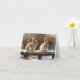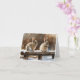 Adorable bunnies sitting on a snow-covered bench on this blank greeting card.