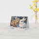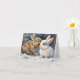 Adorable bunnies snuggled together in the snow on this blank greeting card.