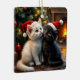 Two adorable, cute kitten with lovely faces - one white, one black, wearing Santa hats cuddle under the Christmas tree in the living room. Wonderful an cute motif for the season - fits for everyone! Beautiful Christmas tree decor for cat lovers, pretty small gift idea!