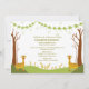 the design shows a baby shower invitation in olive green typography in the middle and agreen woodland with lots of trees and two cute baby giraffes around it. this design is cute and will be ideal for your baby shower.