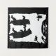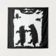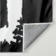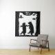This wall tapestry has two dancing black bears in the grass under trees with an owl on a branch watching from above done in black silhouette on white.