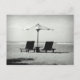 Postcard with black and white photography showing two deck chairs and an umbrella on a beach. Taken at Sanur Beach on Bali Island.