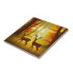 Ceramic tile in an illustration of two deer, a buck and a doe, against a background of autumn woods, in shades of brown, golden yellow and rust orange