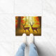 Doormat in an illustration of two deer, a buck and a doe, against a background of autumn woods, in shades of brown, golden yellow and rust orange