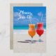 Tropical drinks on the beach, party invitations for a summertime gathering for any occasion. Two frozen cocktails sit in the sand with tropical turquoise water in the background. White text, "Please join us" can easily be changed by you. On the back, a beach sand image holds blue printed text for all party information.