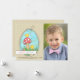 Send Easter greetings to family and friends with this whimsical photo card featuring an egg-shaped window with two baby chicks playing near a mushroom. (FP)