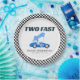 This design features a blue race car theme "Two Fast" for a birthday party with a cute racing car, black and white chequered pattern.