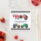 GROWING UP TWO FAST MONSTER TRUCK BIRTHDAY PARTY THEME. COLORFUL TRUCKS WITH BLACK AND WHITE GROOVY CHECKERED PATTERN RETRO STYLE EDITABLE KIDS BIRTHDAY.
