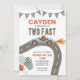 Two Fast Race Car Birthday Invitation with blue retro race car.