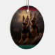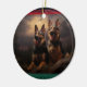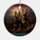 The image features two German Shepherd dogs, one lying down and the other sitting, against a backdrop of a dramatic sunset. The dogs are both looking up, with their tongues slightly out, suggesting a sense of alertness or anticipation. The sky is a mix of dark clouds and a warm orange glow, creating a moody and atmospheric setting. Ideal gift for German shepherds lovers.