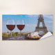 Two glasses of red wine with snacks with view of Paris and Eiffel tower. Glass of red wine with different snacks - plate with ham, sliced, blue cheese. Couple, romantic celebration. Cafe with view